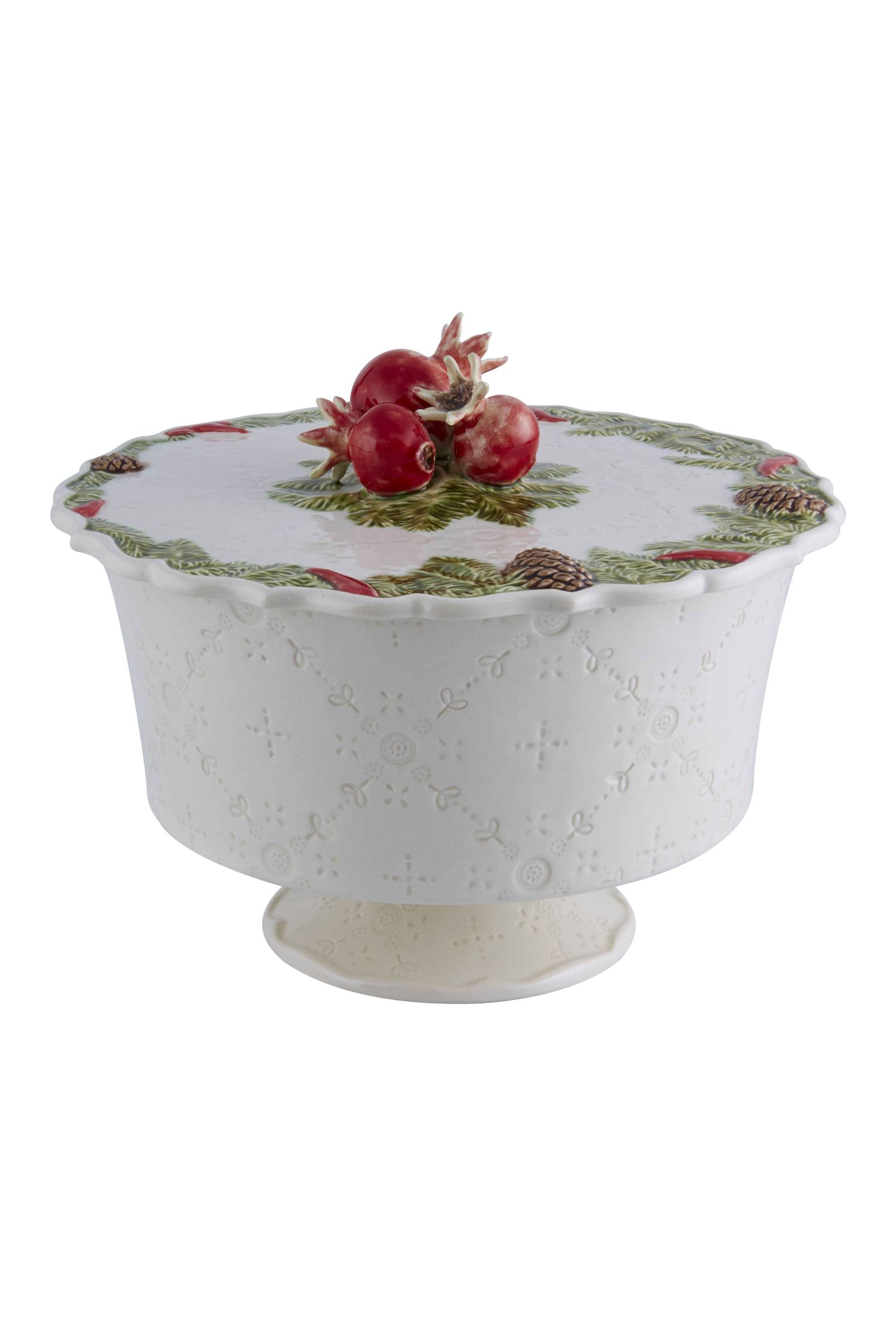 Cette élégante boîte de bonbons basse de Bordallo Pinheiro séduit par son raffinement et ses détails délicatement travaillés. Son décor végétal et son couvercle orné de fruits apportent une touche poétique et sophistiquée à la table ou au buffet.