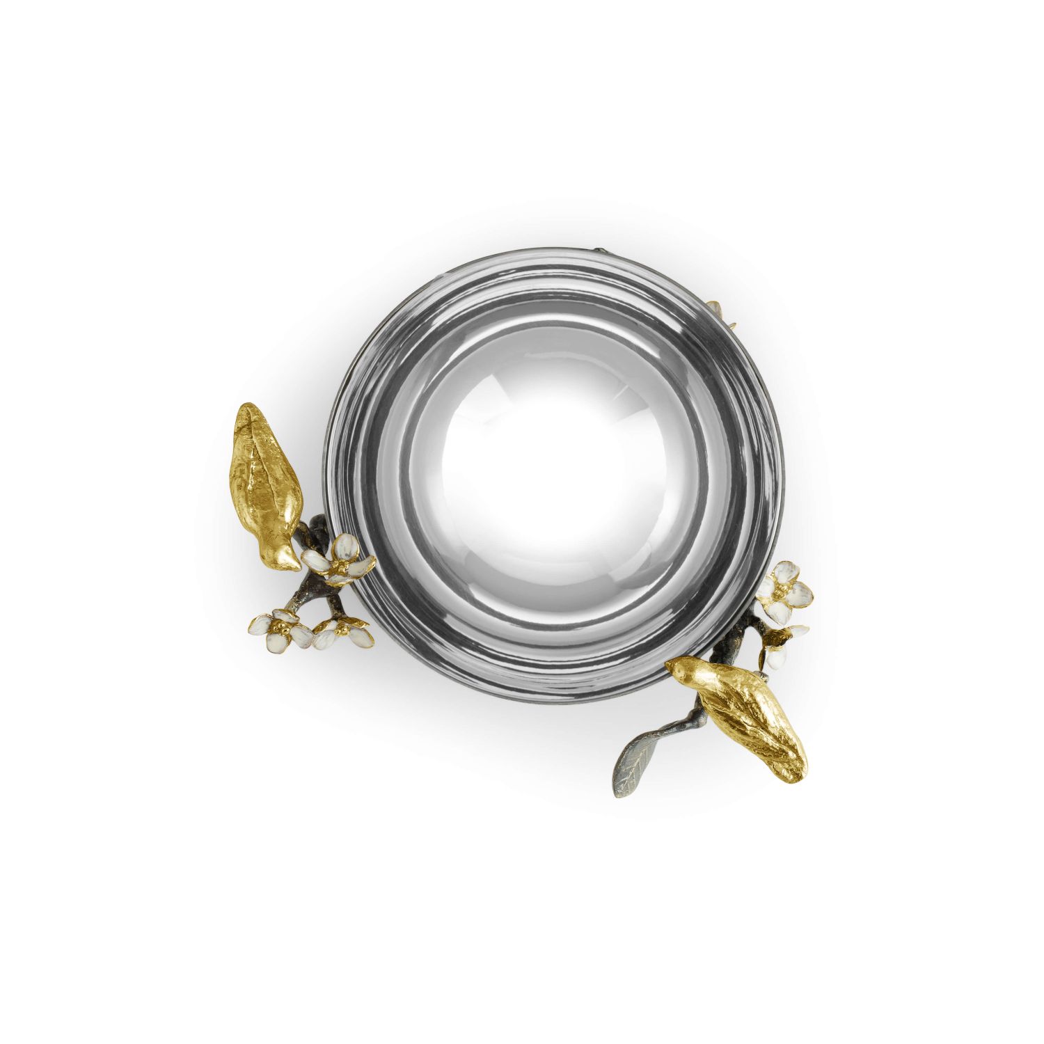 Le bol à noix Lovebirds de Michael Aram incarne l’amour, la douceur et la nature. Deux oiseaux dorés perchés délicatement sur une branche sculptée encadrent un bol en acier inoxydable poli, créant une pièce aussi pratique que poétique.