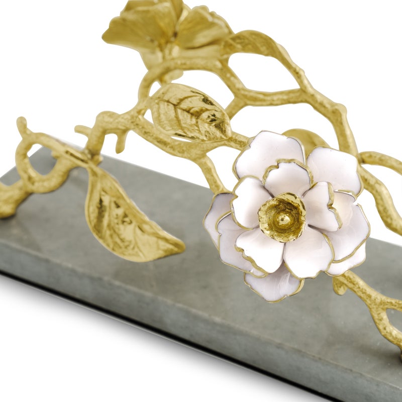 Réalisé en métal doré finement travaillé, le design représente des branches naturelles ornées de feuilles et d’une fleur de gardénia blanche, sculptées avec précision. Le contraste entre l’or et le blanc apporte une harmonie visuelle élégante et lumineuse.