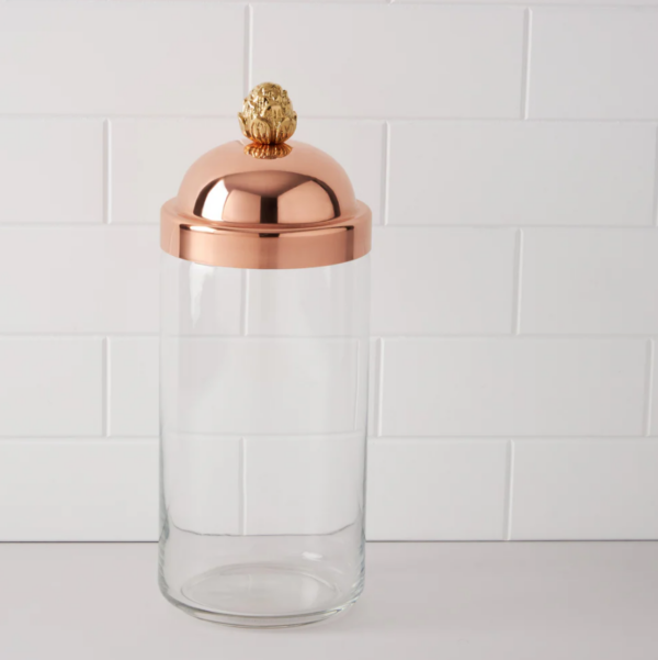 • Fabriqué en verre transparent et en cuivre massif avec un fleuron en bronze en forme d’artichaut.